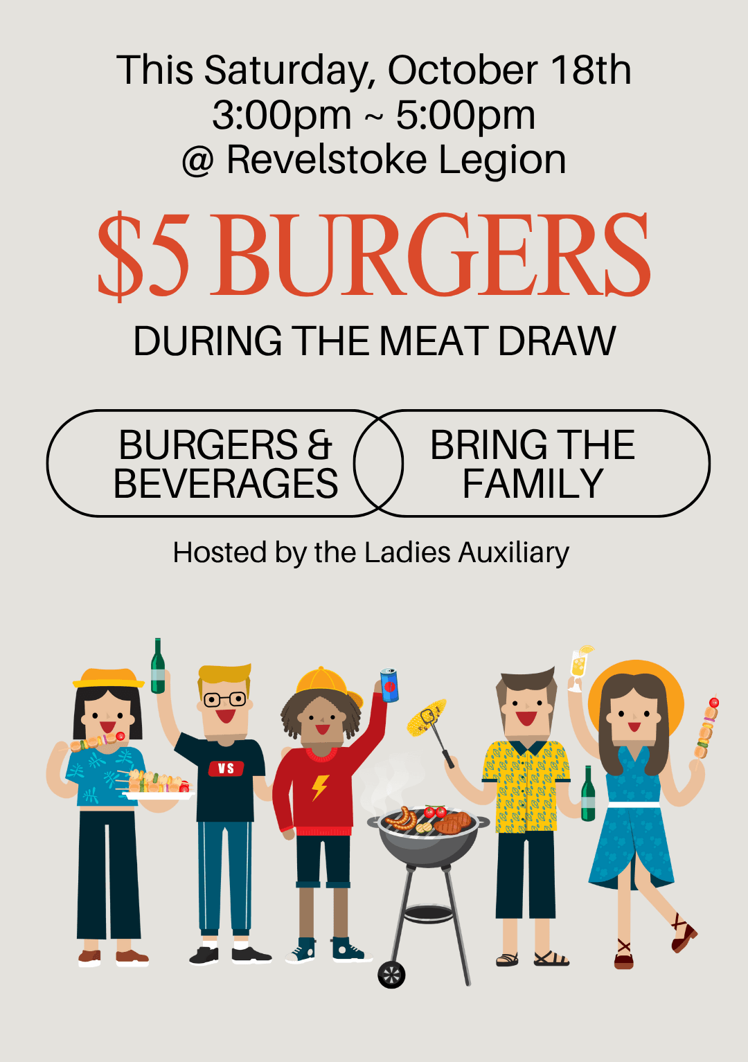 π Burgers, Beverages & Good Times at the Revelstoke Legion! Join us this Saturday, October 18th from 3:00β5:00 PM for a cozy afternoon of community, comfort food, and family-friendly funβhosted by the Ladies Auxiliary.