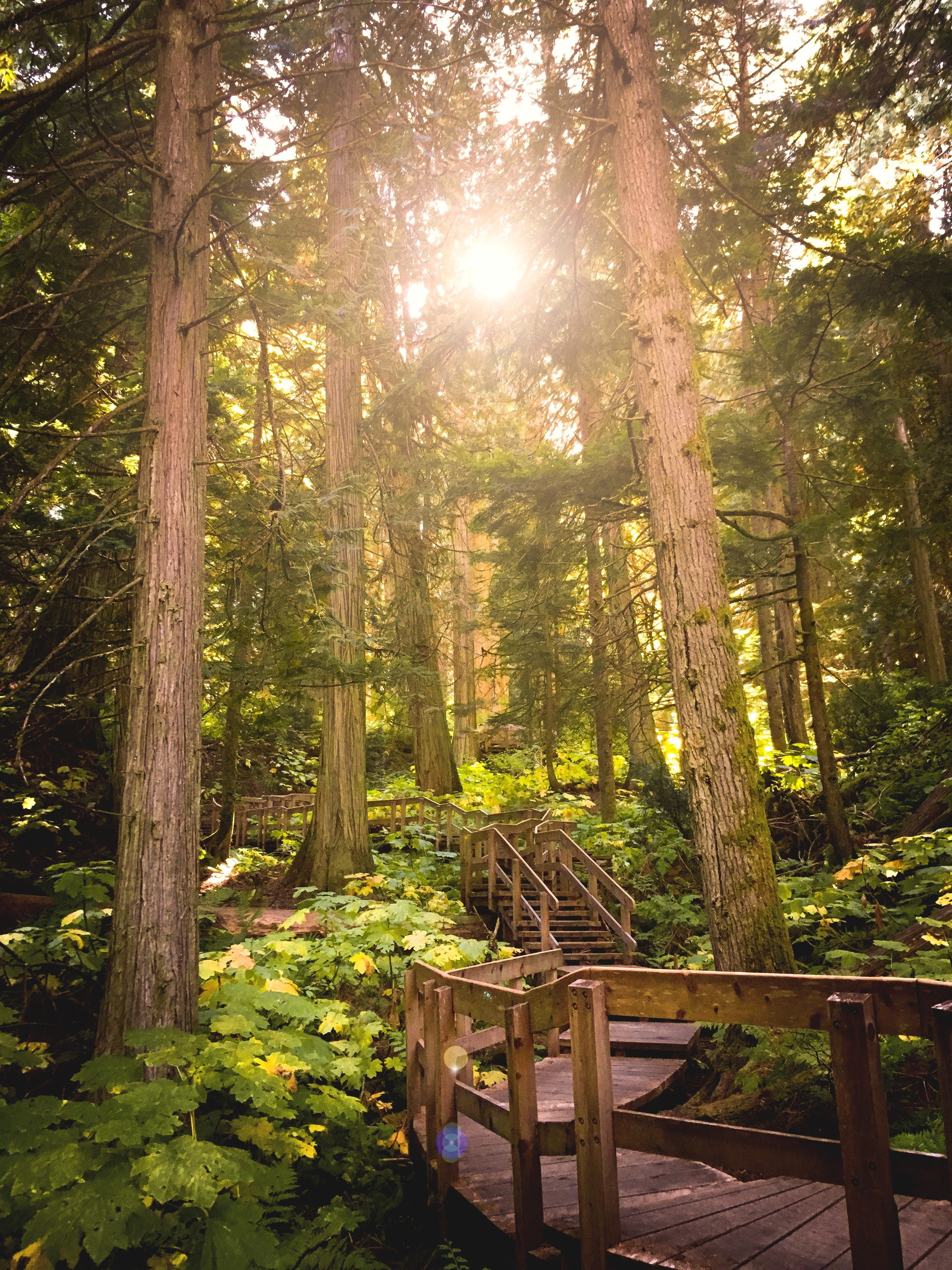 The Giant Cedars Boardwalk offers a short hike through a grove of old-growth cedars. This brief but sweet boardwalk takes you up many stairs to incredible views of the temperate rainforest zone.
