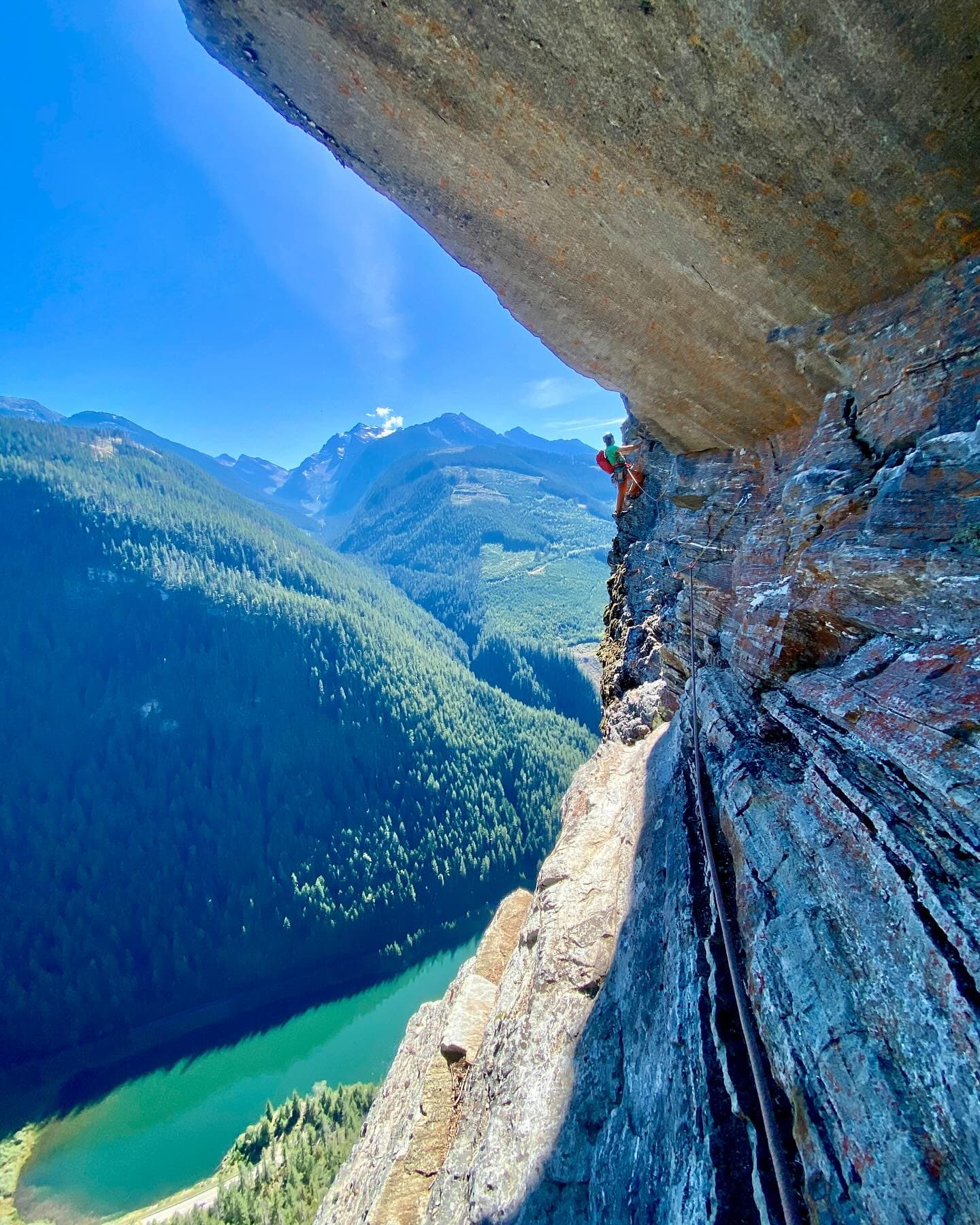 This is a truly unique wall with all the climbs leading up from just above the water line of Lake Revelstoke.