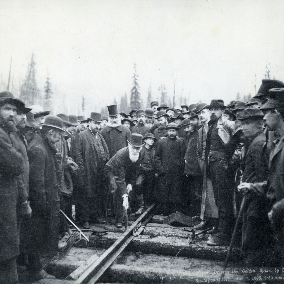 The last spike was driven into the Canadian Pacific Railway at Craigellachie on Nov. 7, 1885. There are two versions of this famous photo. One was of Donald Smith driving a spike into the railway, surrounded by white men in suits.
